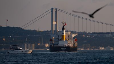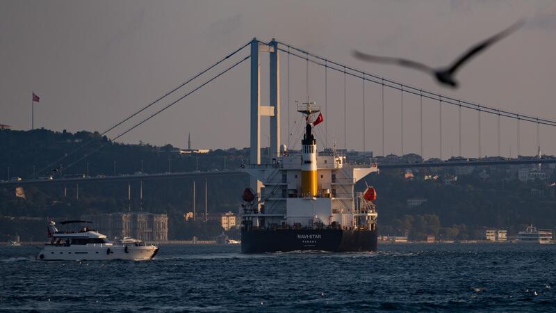 The Panama-flagged bulk carrier Navi Star carrying tons of grain from Ukraine sails along the Bosphorus Strait past Istanbul on August 7, 2022, after being officially inspected. Ukraine and Russia signed a landmark deal with Turkey and the United Nations aimed at relieving the global food crisis. (Photo by Yasin AKGUL / AFP)
