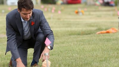 Canada's Prime Minister Justin Trudeau places a teddy bear at an unmarked grave on Cowessess First Nation, where a search had found 751 unmarked graves from the former Marieval Indian Residential School near Grayson, Saskatchewan, Canada July 6, 2021. shannon VANRAES / POOL / AFP