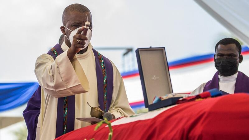Priests pray near the casket of slain President Jovenel Moïse at his funeral on July 23, 2021, in Cap-Haitien, Haiti. Moïse, 53, was shot dead in his home in the early hours of July 7. Valerie Baeriswyl / AFP