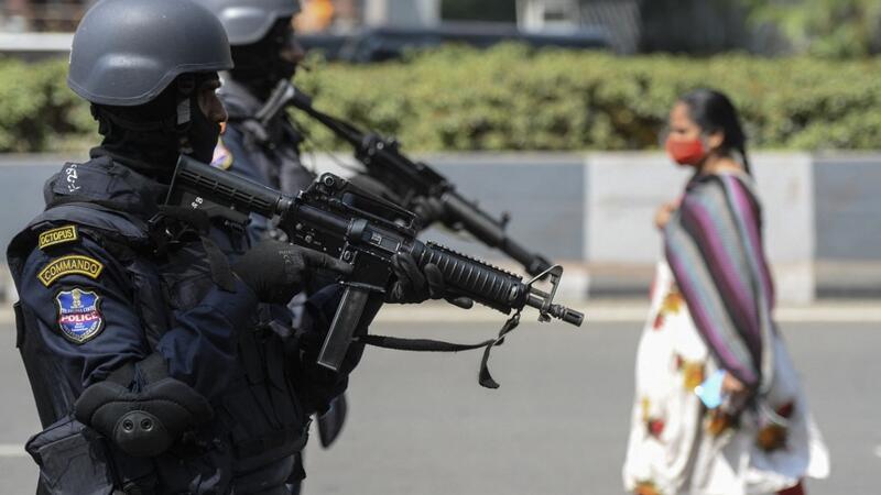 Organisation for Counter Terrorist Operations (OCTOPUS) special police unit commandos stand guard during a security drill in Hyderabad on February 24, 2021. NOAH SEELAM / AFP