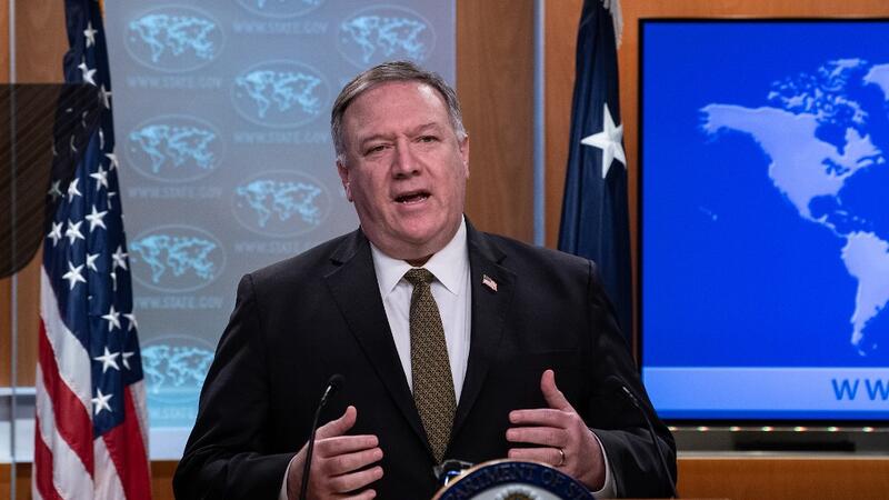 US Secretary of State Mike Pompeo speaks at a press briefing at the State Department in Washington, DC, on April 22, 2020. A controversial decision on whether to annex much of the West Bank is the prerogative of Israel's new unity government, US Secretary of State Mike Pompeo said April 22, 2020. "As for the annexation of the West Bank, the Israelis will ultimately make those decisions," Pompeo told reporters. "That's an Israeli decision." NICHOLAS KAMM / POOL / AFP