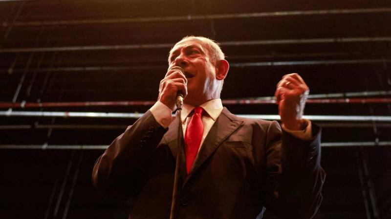 Binyamin Netanyahu, Israel's former prime minister and current leader of the Likud party, speaks before supporters during a campaign rally, October 23, 2022. (AFP)
