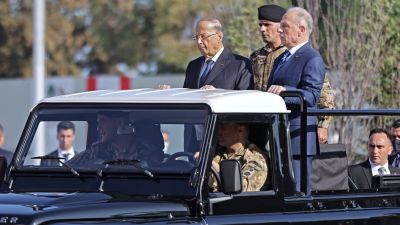 Lebanese President Michel Aoun (L) and Defence Miniser Maurice Slim (R) attend a ceremony marking the 78th anniversary of Lebanon's Independence Day held at the Defence Ministry in Yarzeh on the eastern outskirts of Beirut on November 22, 2021. (Photo by ANWAR AMRO / AFP)
