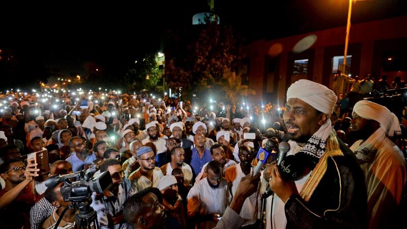 Sudanese hardline cleric Mohamed Ali Jazuli speaks as supporters of Islamist movements rally in front of the Presidential Palace in downtown Khartoum (AFP)