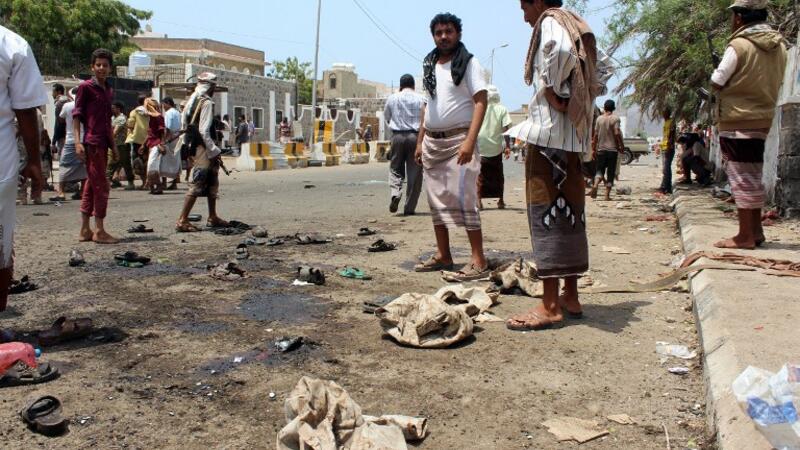 Yemenis gather at the site of a twin bombing that targeted Yemeni forces in the southern city of Aden on May 23, 2016. (AFP/Saleh al-Obeidi)