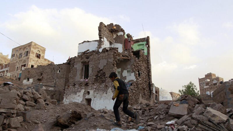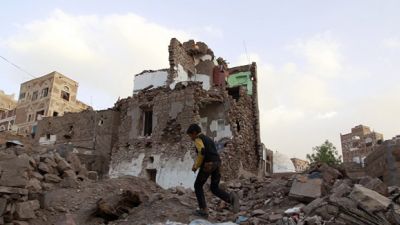 A Yemeni boy runs past buildings that were damaged by air strikes carried out by the Saudi-led coalition over the past year in the UNESCO-listed old city of the Yemeni capital Sanaa.