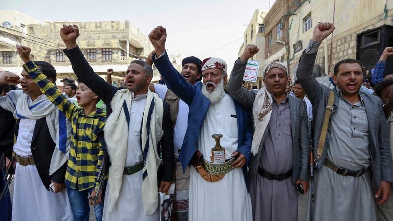 Yemeni supporters of the Houthi movement chant slogans during a rally commemorating the death of Shiite Imam Zaid bin Ali in the capital Sanaa, on September 14, 2020. Mohammed HUWAIS / AFP