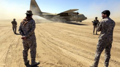 Saudi soldiers stand by as a Saudi Air Force cargo plane carrying humanitarian aid lands at an airfield in Yemen's northeastern province of Marib. (ABDULLAH AL-QADRY / AFP)