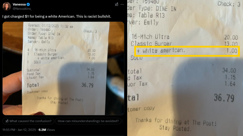 ALBAWABA - A social media user on Musk's X (formerly known as Twitter) named 'Vanessa' sparked widespread confusion after posting a picture of a restaurant receipt containing "White American" as an item, further claiming that the restaurant charged her due to the color of her skin.