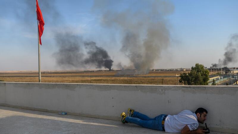 A journalist takes cover in Akcakale near the Turkish border with Syria on October 10, 2019 as a mortar landed nearby, on the second day of Turkey's military operation against Kurdish forces. (AFP)