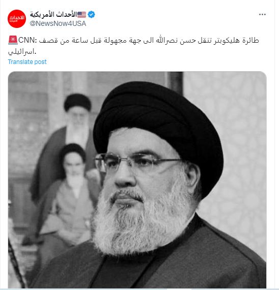 A social media post claimed that Nasrallah, the head of the Iranian-backed militia, had taken a special, secret helicopter earlier on Thursday and was moved to a safe place.