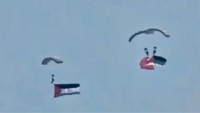 ALBAWABA - This morning, Hebrew accounts started a vicious attack on a group of young guys who were skydiving and flying the Palestinian flag in Aqaba, which is located just meters away from Eilat.