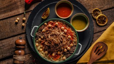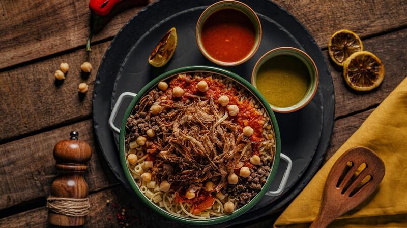 Koshary is a popular Egyptian national dish, consumed by the rich and poor. It is especially admired by vegans not only in Egypt, but also across the Arab world. It contains pasta, rice and brown lentils, and is topped with a zesty tomato sauce, garlic vinegar and garnished with chickpeas and crispy fried onions.