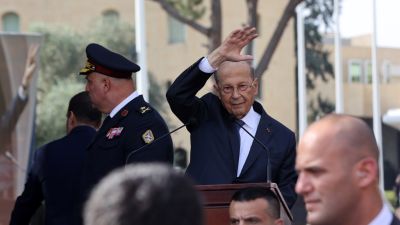 The former president appeared next to Gebran Bassil, who is Aoun's son-in-law, a Lebanese politician and leader of the Free Patriotic Movement.