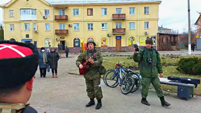 Russian loyalists playing music to a crowd in Schastia, allegedly. It was previously a Ukrainian held town adjacent to the frontline in Luhansk