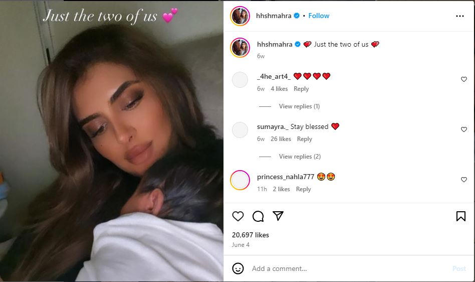 Sheikha Mahra posted, six weeks ago, a picture with her newborn daughter and wrote a caption: "Just the two of us". The photo is now trending again after the divorce post shared on the Dubai royal's official Instagram account that went viral quickly.