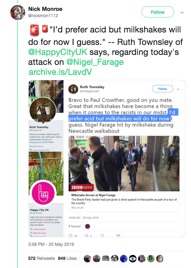 According to the Sun a hipster Corbynista "lobbed" a premium salted caramel milkshake at Mr. Farage, who was campaigning in Newcastle on the 20th of May. The Brexit party leader responded that the shake was "yobbo flavored" and later posted a picture reading "Whatever they throw at us they will never give up."