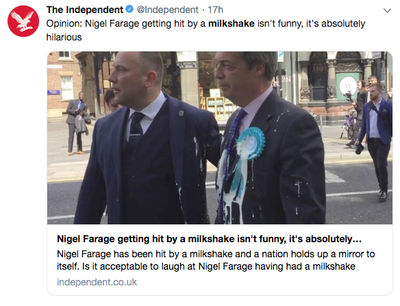 Earlier this week Nigel Farage, the leader of the surging 'BREXIT Party' in the United Kingdom was attacked with a milkshake - technically classed as an assault under British Common Law. Legal arguments aside, media and twitter culture seems to be divided about the incident. As so often, the arguments for and against are divided along ideological lines.