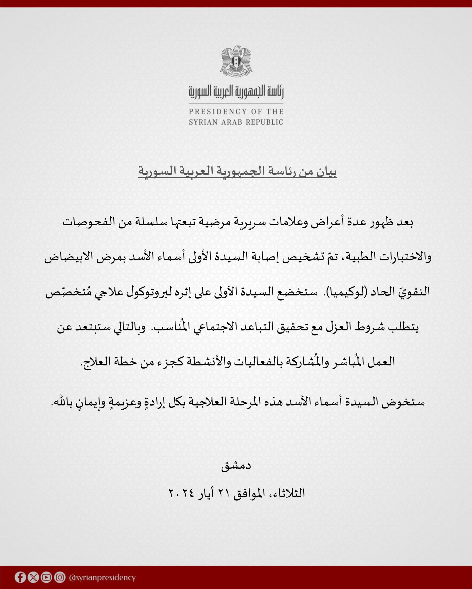 The statement published by the Presidency of the Syrian Arab Republic a few minutes ago on social media platforms revealed that Asma Assad, 48, recently underwent a series of medical and laboratory tests.
