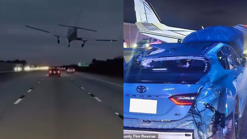 The 57-year-old woman, who was driving a 2023 Toyota Camry, was hospitalized with minor injuries. However, the 27-year-old pilot and the passenger were both unharmed. According to NTSB, the plane, identified as a Beechcraft 55, experienced a "loss of power in both engines," forcing the pilot to make an emergency landing.
