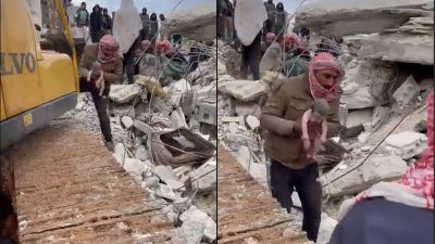 In the video, a man is seen holding the baby right after his birth in one of the buildings destroyed by the 7.8-magnitude earthquake, which rattled Syria and southern Turkey early Monday.