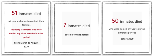 From March 9 to August 2020, detainees were reportedly infected with coronavirus. 11 people and a lawyer confirmed that they were denied the right to visit inmates during this period, and 9 confirmed that they did not even receive a single written letter from their loved ones inside the prison.