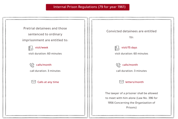 Article 42 of the Prison Regulation Law allows for visits to be restricted or completely banned due to health or security reasons. According to a HRW report, Interior Ministry officials rely on this vaguely worded article, unchanged since 1956, to prevent visits at any time without explaining the reasons thereof.