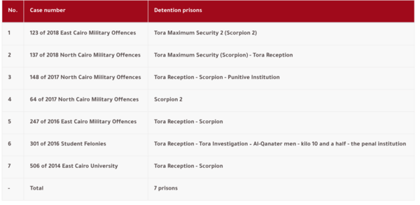 Ahmed Mufreh, Executive Director of Committee for Justice, said, “From our continuous follow-up, (64/2017 military, 123/2018 military, 148/2017 military), the Prison Authority continues to renew the visit bans for 20 detainees by virtue of decisions by the Public Prosecution. These inmates are divided between Tora High Security Prison (Scorpion), Tora Istiqbal (reception), and Tora investigation.