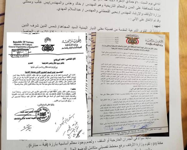 * photos of the documents related to the demolition of Al-Nahrain Mosque located in the Bab Al-Sabbah neighborhood, overlooking Al-Sai’lah.