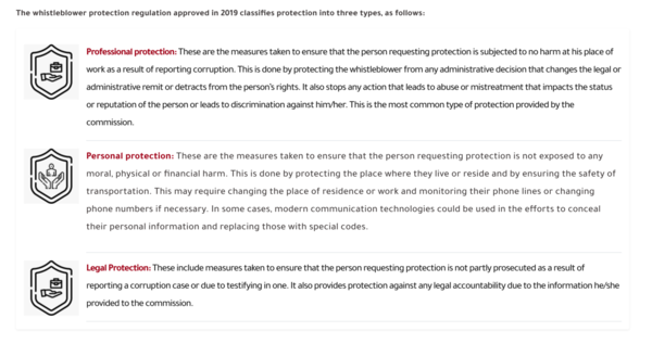 The whistleblower protection regulation approved in 2019 classifies protection into three types, as follows:
