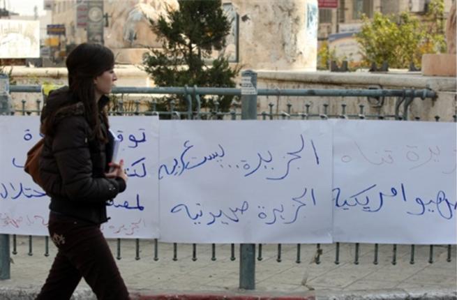A Palestinian woman walks past placards denouncing Al-Jazeera during a protest near the offices of the pan-Arab news channel.
