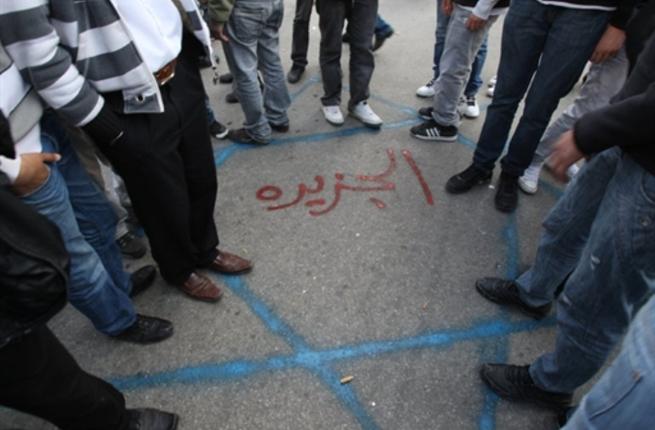 Palestinian protesters step on a Star of David sprayed on the ground with the name of the Al-Jazeera written in red Arabic letters in the middle during a demonstration in the West Bank city of Ramallah.