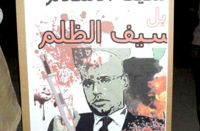 "Saif for-Islam" now "Saif for-Abuse"; punning on the name of second son of Qaddafi, Saif al-Islam.