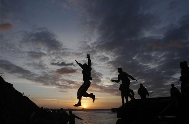 Palestinian boys jump from the top of a sand pile at the beach in Gaza City as they play outdoors during sunset, following storms and heavy rain that poured over the impoverished territory after months of drought.