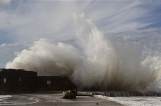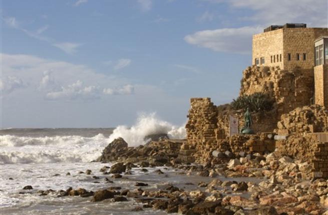 Waves smash into breakers protecting the Roman-era port of Caesarea after a massive storm battering the eastern Mediterranean destroyed the breakers threatening to wash away the historic site, Israeli officials said.