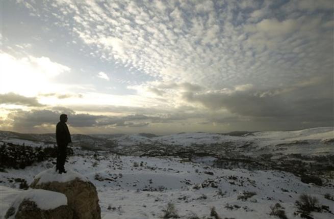 A Lebanese forest ranger observes the sunset from the cedar trees reserve of Baruk in the Shouf mountains, southeast of Beirut, following a snow storm and cold wave which hit the east Mediterranean country after several months of drought.
