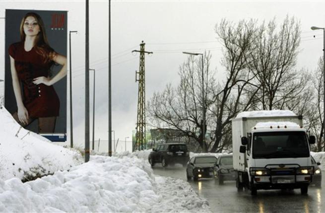Traffic moves slowly in both directions on the main highway linking Beirut to Damascus near the mountain village of Sawfar during a snow storm which hit the Mediterranean country.