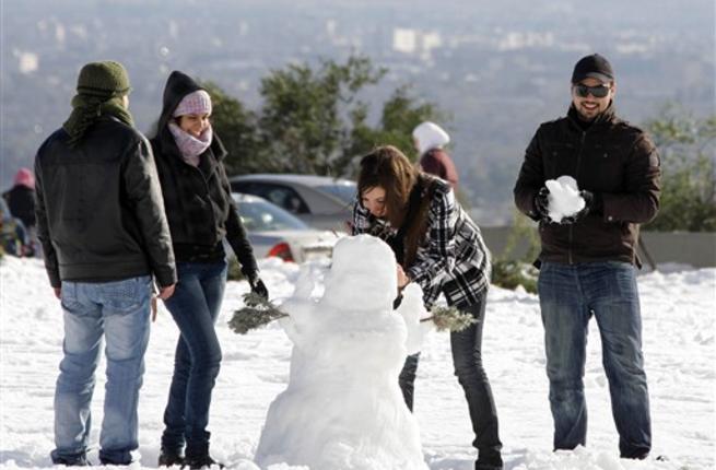 Syrians play with snow in Damascus as the Syrian capital was lashed by a snowstorm which disrupted traffic but brought some relief from a drought which has gripped the country for the past four years.