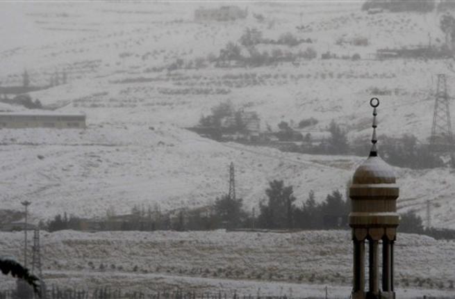 Snow covers the minaret of a mosque in Damascus as the Syrian capital was lashed by a snowstorm which disrupted traffic but brought some relief from a drought which has gripped the country for the past four years.