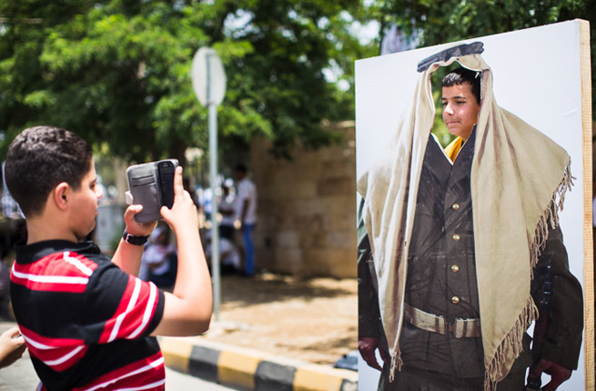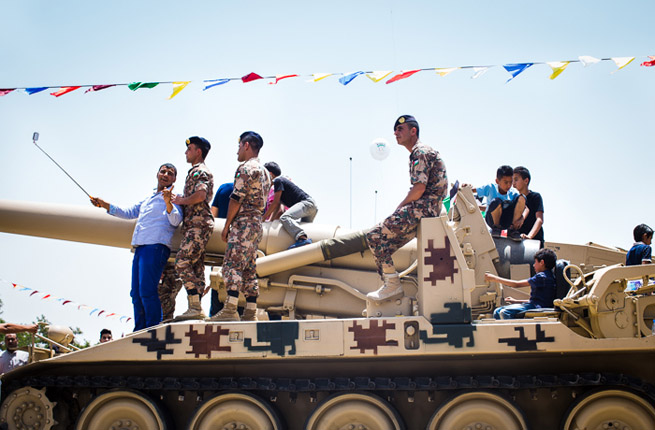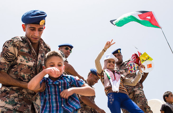 A Jordanian soldier helps a boy get on top of a tank for a photo, while another woman poses with soldiers. Large official and impromptu celebrations were held in Amman to mark the centennial of the Great Arab Revolt on June 3, 2016.