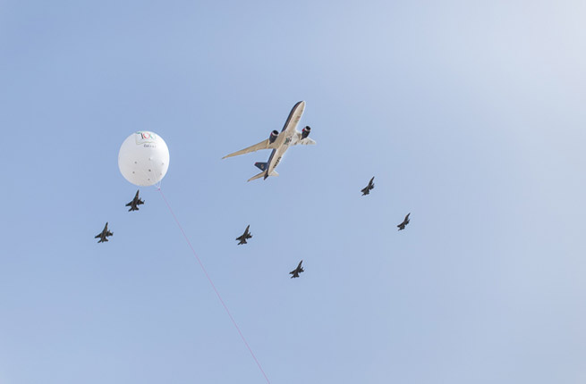 A Royal Jordanian commercial plane flies overhead, flanked by fighter jets from Jordan's air force as part of celebrations marking the centennial of the Great Arab Revolt in Amman.