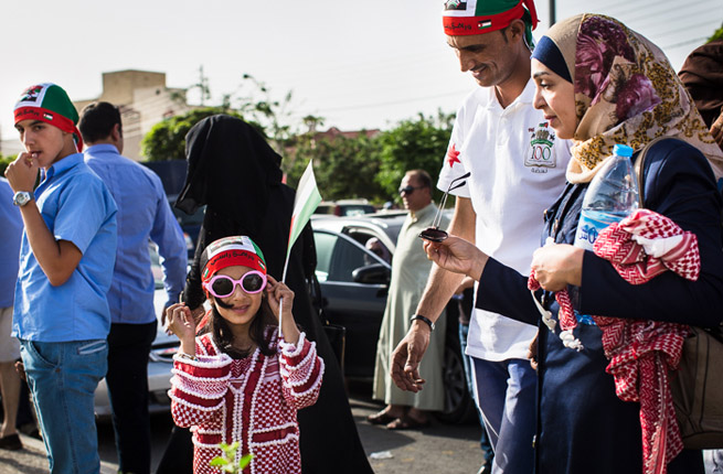 A parade chanting slogans in support of King Abdullah II passes through the crowd outside King Hussein Park in Amman, Jordan, as people gathered to celebrate the 100th anniversary of the Great Arab Revolt on June 3, 2016.