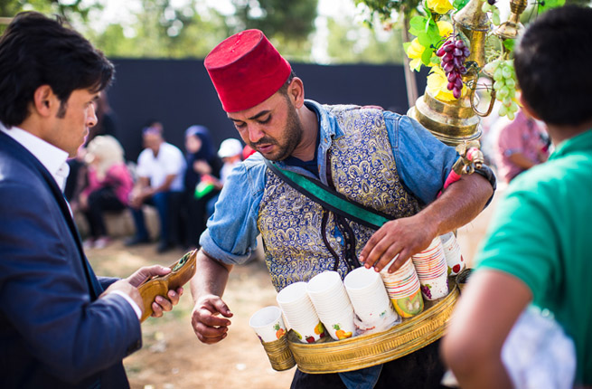 A Jordanian man wearing an Ottoman-style vest and fez, pours iced hibiscus juice for thirsty festival-goers at King Hussein Park on the centennial of the Great Arab Revolt on June 3, 2016.