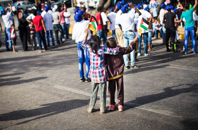 A brother and sister wave flags and watch as planes from the Royal Jordanian Air Force fly overhead in the air show.