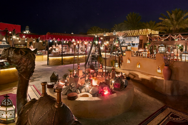 Al Hadheerah Tent at Bab Al Shams Al Hadheerah tent is offering Emirati, Egyptian, Syrian and Lebanese culinary cultures, besides barbecue grill, Ouzi makmour, a shawarma station and authentic manakeesh-and Arabic bread-baking stations. What's more, you can stay after Iftar to watch captivating live oud performances, horse and camel caravan shows.