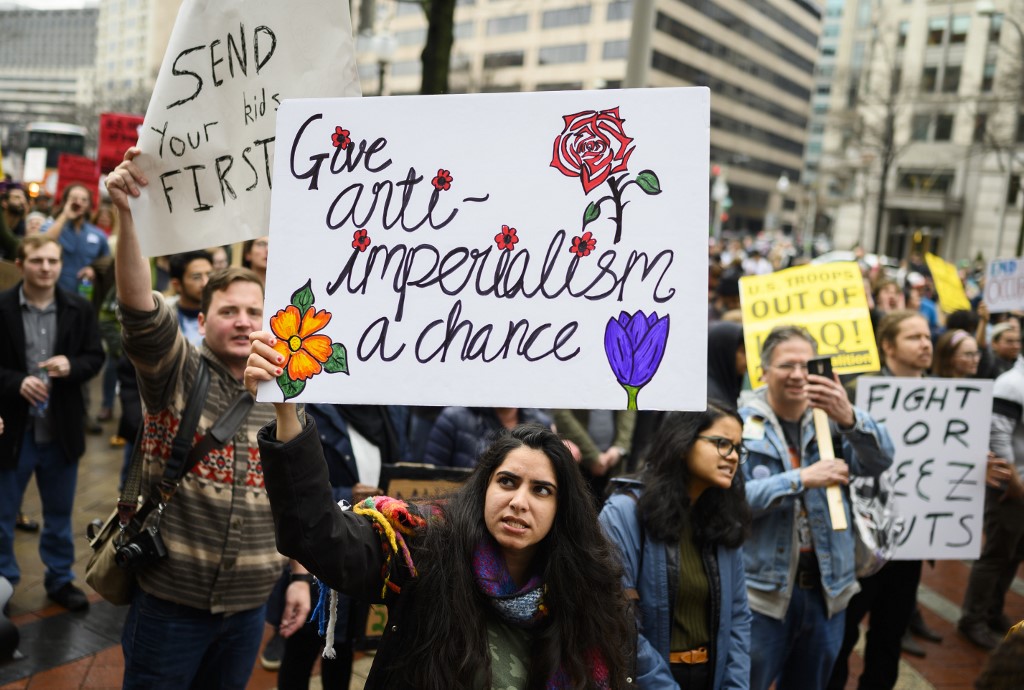 “We will not allow our country to be led into another reckless war,” one speaker outside the White House said.