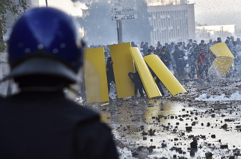 Algerian protesters use makeshift barriers during clashes with security forces amidst protests against ailing President Abdelaziz Bouteflika's bid for a fifth term in power in the capital RYAD KRAMDI / AFP