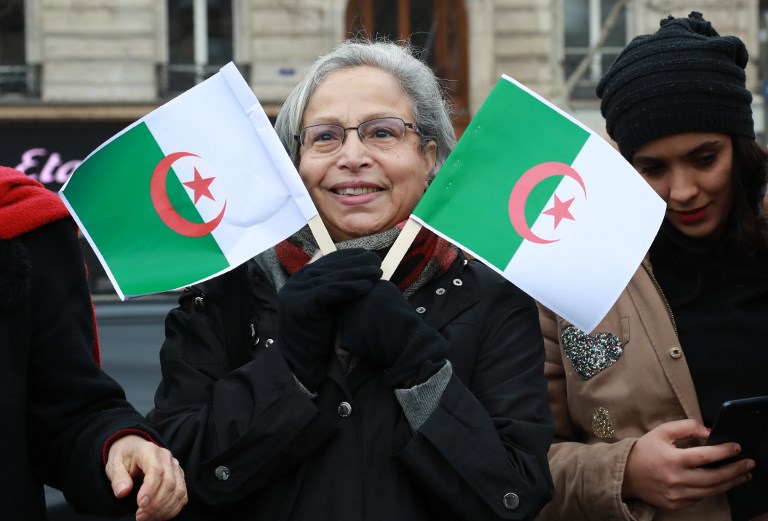 A woman holds Algerian flags during a rally against ailing Algerian president's decision to stand for a fifth term in office JACQUES DEMARTHON / AFP