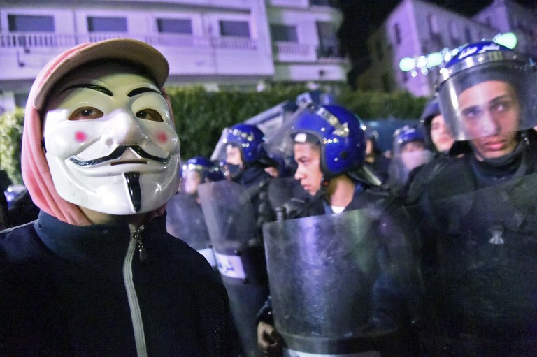Algerian police stand guard during a demonstration in the capital Algiers against ailing President Abdelaziz Bouteflika's bid for a fifth term