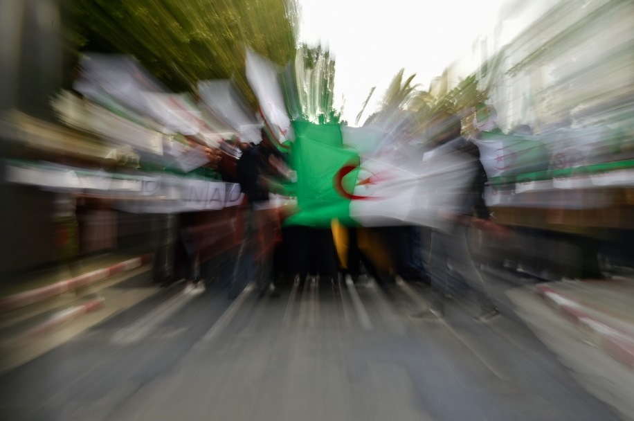 Protesters hold Algerian national flags during a sit-in against the Algerian president's bid for a fifth term in office
